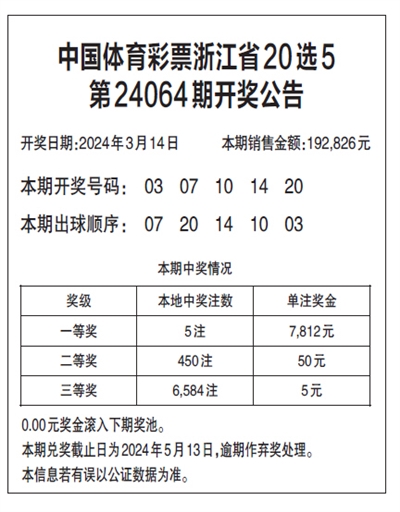 中国体育彩票浙江省20选5 第24064期开奖公告