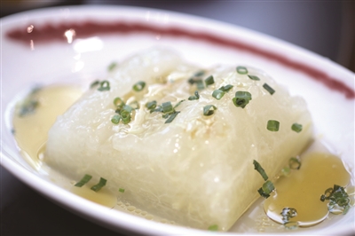 店里还有一个隐藏的小菜,有时遇到店里来了宁波籍的客人,朱进才有可能拿出来。那是他对宁波特产臭冬瓜做的改良,毕竟臭冬瓜的“杀伤力”太强悍了,却又舍不得那一口家乡的味道,就不用臭卤,仅用盐腌制、再经短暂的发酵,咸鲜而微酸,太开胃了。