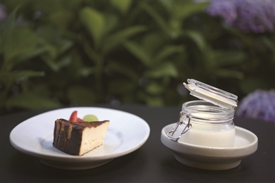 再就是甜品中的蓝纹芝士巴斯克了,蓝纹芝士本身是有点臭臭的,用来做巴斯克,因为用量少,既看不到那独特的蓝色纹理,臭味也很淡了,只是那咸咸的味道不容忽视,提醒你这不是普通的芝士蛋糕。