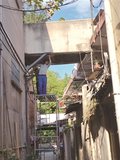 9月3日上午,记者再次来到药店弄,施工人员已经在作业,但施工方案改了,改成加固,在一面靠围墙的地方加设钢结构立柱和三角形支撑。