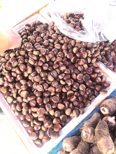 昨天,记者去临平红丰农贸市场买菜,发现一个蔬菜摊位上,摆出了一堆新鲜栗子,可能怕大家不识货,老板还特意拿了一块泡沫板,特别标注是本地的“安吉板栗”,5元一斤。