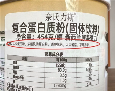 配料表上,按照每100克蛋白粉来计算,蛋白质含量是83%,脂肪含量是3.5%,碳水化合物含量是1%。只要不是对牛奶和大豆过敏,基本上都可以放心吃。