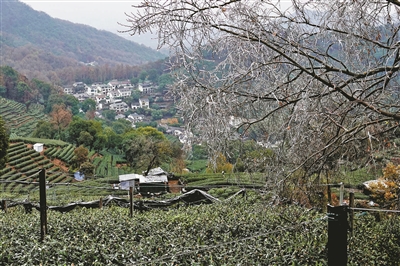 12月18日晚间,杭城飘落小雨夹雪。在气温更低一些的西湖街道翁家山村龙井茶园里,至19日清晨,茶树叶上浅浅的雪水已凝结成冰,裹住枝干叶面。