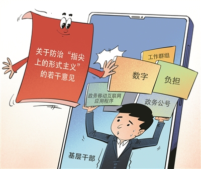 《瞭望》周刊盘点形形色色的形式主义,其中之一是“数字赋能”变成“数字负担”。一些基层干部反映,近年来,政务新媒体发挥了推进政务公开、优化政务服务、创新社会治理等作用,但也出现了技术赋能变“指尖上形式主义”等问题。近日,中央网络安全和信息化委员会印发《关于防治“指尖上的形式主义”的若干意见》,要求全面贯彻习近平总书记关于力戒形式主义官僚主义的重要论述精神,加强对政务移动互联网应用程序、政务公众账号和工作群组的标准化规范化管理。 漫画 勾犇