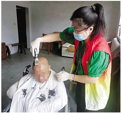 护理人员上门为城南街道大丰村失能人员理发。 汪学文 摄