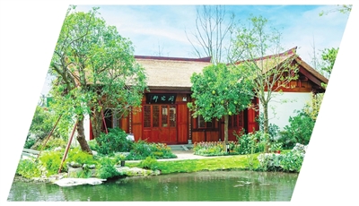 在建筑设计和室内文化陈设等方面,杭州园深受宋代绘画启发,生动展现了宋韵文化特色。园内“清泉堂”采用宋式“悬鱼”,既满足了结构需求,又起到了装饰作用,充分表达了人民祈福纳祥的美好愿景。“闲定轩”整体简洁内敛、古朴典雅,建筑采用了宋式海芦苇屋面,营建手法精细独特、编制工艺繁琐复杂、呈现效果自然雅致;山墙采用椒墙的做法,用“花椒涂壁”既提高墙体保温功能,又有防蛀虫效果;屋内展陈提炼宋代画作灵感,布宋式屏风、摆仿宋家具,将宋人尊重自然、追求雅致的生活态度完美还原。