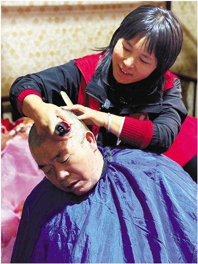 后来,她把自己的理发店发展成了村里的便民服务点,每周一三五日去附近的养老院为老人理发,二四六在村里服务,“只要有人拿着残疾证或者是低保证明来理发,我都不收钱。”2016年,她与小伙伴在富阳新登镇成立了蓝天为老服务中心,免费为老人提供理发、洗澡、按摩、剪指甲、测量血压等服务项目。2019年,她又在服务中心里推出了“临终关怀”项目——为处于弥留之际的老人理发。