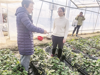 气象工作人员指导草莓种植户如何防寒抗冻。