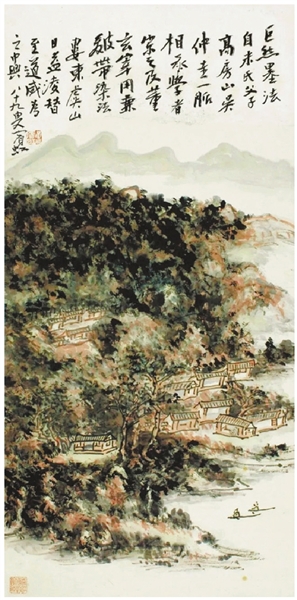 《山水》,黄宾虹,68.1cm×31.9cm,1952年,纸本设色,浙江省博物馆藏