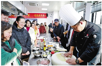 本报讯(记者 章翌 通讯员 石琼瑛)“稍微裹点粉层,表面颗粒感就强了,炸出来香喷喷,卖相也好看,老人小孩都爱吃。”杭州教育工匠潘巍正讲解着腐皮葱包肉的做法,灶台前,30多位市民看得很认真,不时拿手机录制视频。