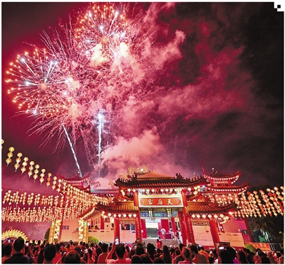 时差挡不住世界各地华人华侨庆祝元宵佳节的热情。庙会、专场文艺演出、猜灯谜等活动在全球多地举行,海外民众与华侨华人共同感受节日的美好氛围,体验并感悟中国传统文化。图为2月24日在马来西亚首都吉隆坡举行的天后宫烟花表演,众多市民到场一同庆祝元宵佳节。