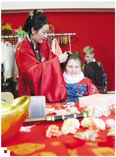 图④:24日,小朋友在比利时班什举行的“金龙迎新——2024比利时生肖设计展”上体验汉服妆造。