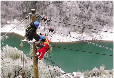 由于连日低温和雨雪交加,整个白水墩村被白雪覆盖,电线杆、导线被厚实的冰雪包裹。费子雨挥动砍刀将倒伏在地上的毛竹、树枝砍断并移开,为身后抬着材料的同伴开路。“地面已经雪上加冰、冰上加雪,变成‘多层蛋糕’了,走路容易打滑。”大家相互配合,深一脚浅一脚地在雪地上艰难地行进,将工具、材料运到电线杆下。