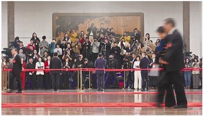 3月10日,全国政协十四届二次会议第三场“委员通道”集体采访活动在北京人民大会堂举行,海内外媒体记者进行采访。 新华社记者 宋为伟 摄