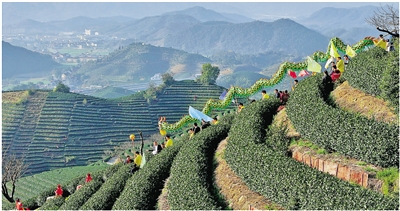 图为在富阳区富春街道拔山村的茶山上,一条绿色的“拔山茶龙”游走于万亩茶园间,村民们以“喊山祈茶”的形式,祈福今年“拔山高峰茶”的丰收,也由此拉开了“相约上春山,遇见新拔山——2024拔山开茶节暨‘高峰对决’手工炒茶传承赛”的大幕。拔山村有着全杭州面积最大的万亩连片山地茶园,盛产以龙井茶系为主的“拔山高峰茶”,品质上乘。今年的拔山开茶节除了恢复了传统的“茶龙巡山”和“喊山祈茶”仪式外,还将举办由村里5位炒茶大师领衔的手工炒茶传承赛,并推出面向游客的研学游、登山游、采茶游、骑行游等茶乡踏春线路。通讯员 陈东 记者 骆炳浩 文 记者 李忠 摄