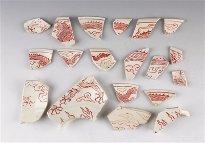 山西霍州陈村瓷窑址出土的明代细白瓷矾红彩龙纹残片。