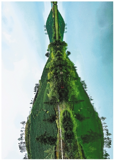 蓝天白云之下,一泓明镜般的碧波,倒映着青翠欲滴的连绵茶园,宛若一支狭长的笔尖,蘸着桃花春水描绘青绿画卷……春茶采摘时节,一幅唯美的茶园倒影航拍横图,因为被意外旋转了方向而惊艳了富阳的朋友圈。