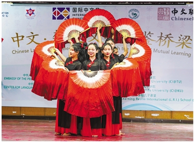 4月19日,在尼泊尔首都加德满都举行的中文日庆祝活动上,孔子课堂学员表演中国舞蹈。 新华社发(哈里·马哈尔詹 摄)