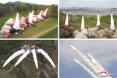 这张朝中社提供的拼版照片显示的是4月22日拍摄的火箭炮齐射画面。 新华社发