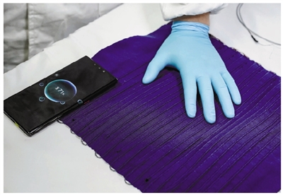 4月22日,复旦大学的研究人员展示手机可放在编织有纤维电池的织物上充电。新华社发