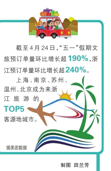 据美团数据,截至4月24日,“五一”假期文旅预订单量(含景区、住宿、交通等)环比增长超190%,浙江预订单量环比增长超240%。其中,杭州、宁波、湖州成为深受游客欢迎的浙江TOP3热门目的地。从客源地来看,上海、南京、苏州、温州、北京成为来浙江旅游的TOP5客源地城市。