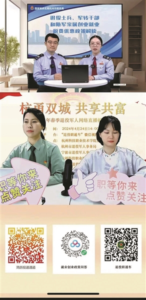 本报讯(记者 温欣欣 通讯员 胡舰航)4月24日,“杭甬双城 共享共富”直播带岗活动在微信视频号“退役职通车”开展。本次招聘会由杭州市退役军人事务局联合宁波市退役军人事务局、杭州市税务局、杭州科技职业技术学院(杭州退役军人教育培训学院)共同举办。