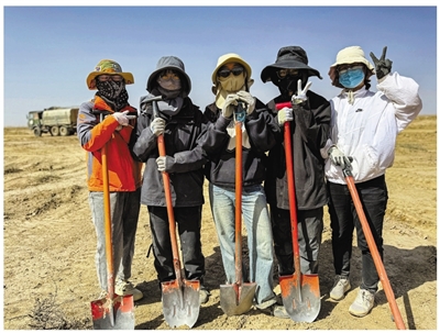 已近中午12点,看见五个拎着铁锹的姑娘远远走来,她们并不相识,只是因为种梭梭才在民勤相遇,有的是来自广州的大学生,有的是第一次来参加春种,有的则已经持续多年。