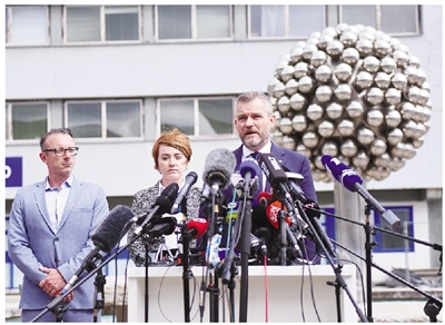 5月16日,在斯洛伐克班斯卡-比斯特里察,斯洛伐克候任总统佩列格里尼(右)在救治总理菲佐的医院门前对媒体讲话。 新华社记者 贺灿铃 摄