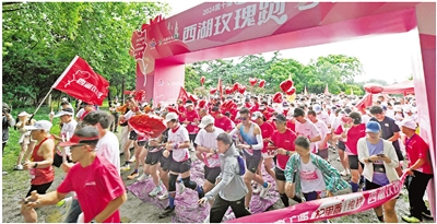 6月1日早晨,已连续举办至第十届的“西湖玫瑰跑”,在西湖天地鸣笛起跑。来自全国各地的2500余名健身爱好者,环绕西湖跑出一条总长23公里的玫瑰花形足迹,共同感受浪漫欢快的全民健身浓厚氛围和美丽西湖的历史文化底蕴。