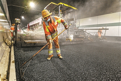 本报讯(通讯员 杭建宣 记者 王莉莉 文 记者 张之冰 摄)运输车源源不断地运来沥青料;两台摊铺机联合“作战”,推开热气腾腾的沥青混凝土;钢轮压路机来回穿梭;工人们忙碌而有序地施工……昨天上午,在隆隆的机械轰鸣声中,记者在文一路(紫金港立交—荆长大道)提升改造工程的隧道施工现场看到,沥青铺设工序正紧锣密鼓推进中。