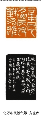 同样,叶潞渊“问苍茫大地谁主沉浮”一印,以豪迈明快的刀法,表达了一代革命青年在时代浪潮里的凌云壮志,勇敢地投身于革命风浪中;方去疾的“亿万农民战气雄”,则以刚劲笔力,再现了秋收起义的英勇与悲壮,每一道刻痕都仿佛在诉说那段烽火岁月的不屈与坚韧;高式熊的“瑞金”,以其独到的刀工,细腻勾勒出红色故都的历史纹理,让人在方寸之间感受到那段光辉岁月的重量与温度。