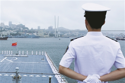 右图:7月26日,中国海军舰艇编队抵达符拉迪沃斯托克参加俄海军成立328周年庆祝活动。 新华社发(钟迪倩 摄)