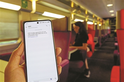 这是7月26日在法国里尔至巴黎的火车上拍摄的列车延误通知短信。 新华社记者 孟鼎博 摄