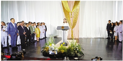 当天在为泰党总部举行的仪式上,阿帕现场宣读王室谕令。佩通坦在接受任命后表示,她将尽最大努力承担起总理职责,让泰国成为机遇之国。