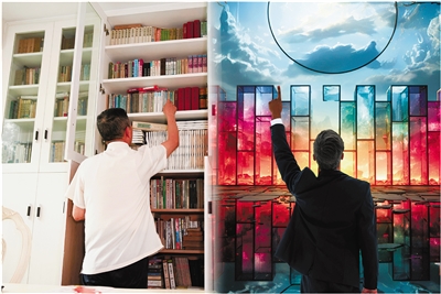 曹晓波从书柜上取书。 AI杭州畅想·纳百家之言,建起“云上城市记忆档案馆”。