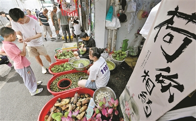 时下正是“荷塘三宝”大量上市的季节。在上城区大马弄市场里,许多经营户都摆出了摊位,专卖时鲜的莲子、莲藕及菱角等,不少市民专门赶来选购这一份夏日专属的美食与浪漫。 记者 李忠 摄