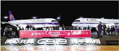 8月28日在中国商飞总装制造中心浦东基地拍摄的国产大飞机C919交付仪式现场。当日,中国国际航空公司和中国南方航空公司在中国商飞总装制造中心浦东基地同时接收首架C919飞机。这标志着C919飞机即将开启多用户运营新阶段。新华社记者 方喆 摄