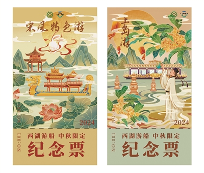 杭州市西湖游船有限公司工作人员介绍,今年中秋限定纪念船票融入了杭州老市长“苏东坡”、杭州市花“桂花”、西湖特色水生植物“荷花”及“三潭印月”“湖滨晴雨”等元素,色彩上分别以黄色、红色等暖色调,绿色、白色等冷色调绘制“团圆”“思念”意象图案,辅以云卷云舒的浪漫手法营造节日氛围,希望在这月光如水的团圆之日,人欢聚、同举杯、共欢庆。