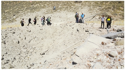 图为10月4日,在黎巴嫩东部迈斯纳边境口岸附近,人们步行穿过遭以色列空袭受损的通往叙利亚的国际公路。