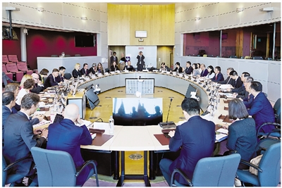 这是9月19日在比利时布鲁塞尔欧盟总部拍摄的中欧双方工作团队就欧盟对华电动汽车反补贴案的磋商现场。 新华社记者 孟鼎博 摄