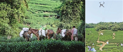 初秋时节,正是给西湖龙井茶树追施秋肥的时候。连日来,在九溪路边的山脚下,常能见到茶农们请来的“骡帮”师傅赶着擅长负重爬山的骡子,将一袋袋菜籽饼驮运上山;在西湖区留下街道东穆坞村,还有村民将平时喷洒农药的大型无人机用来空运肥料。