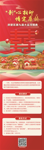 金秋时节,桂香氤氲。在杭州最灿烂甜蜜的日子,大运河畔又要办喜事啦——由康桥街道承办的拱墅区第九届大运河婚典即将幸福开启。今年的婚典重点招募生活或工作在拱墅区的新杭州人,为他们举办一场别具运河民俗特色的集体婚礼。