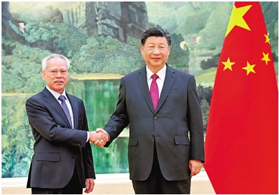 11月1日下午,国家主席习近平在北京人民大会堂会见新当选并获中央政府任命的澳门特别行政区第六任行政长官岑浩辉。新华社记者 谢环驰 摄