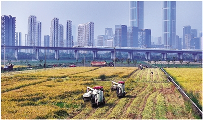 昨天,在位于钱江世纪城东南侧的盈丰地块连片稻田里,5台收割机正开足马力,忙着收割晚稻。金黄色的稻田与钱江世纪城的高楼大厦及飞驰而过的高铁列车毗邻同框,构成一幅田园与城市、现代与传统交织的“新田园丰收图”。记者 李忠 摄