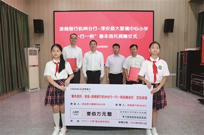 一行一校方面,浙商银行杭州分行在2022年5月与淳安县大墅镇中心小学结对。两年多来,浙商银行杭州分行累计向大墅镇小捐赠了130多万元助学基金,帮助大墅镇小的孩子们获得更舒适的教学环境、更优质的教育内容。今年5月,为进一步升维帮扶合作,浙商银行杭州分行发布了“一行一校·六个一工程”,通过“一个信托”“一杯牛奶”“一套校服”“一次结对”“一场研学”“一项课题”,逐步走出了从补助困难学生到改善教学环境,再到改变学生精神面貌的新路。