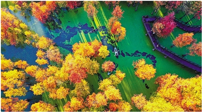 冬已至,这几天,临安区青山湖景区水上森林已被寒风和阳光调成了五彩斑斓的色彩,宛若童话世界,吸引各地游客纷至沓来,漫步水上游步道、泛舟林下青萍漾、骑行水天一线间。位于青山湖北湖区的水上森林面积约5万平方米,生长着1万多棵池杉和落羽杉。水上森林的四季景色各有千秋,尤以秋末冬初时节最为绚丽多彩。通讯员 金凯华 记者 李忠 摄