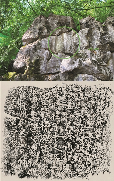林木荫翳中的唐卢元辅诗刻(下为拓片)。郭卫 摄