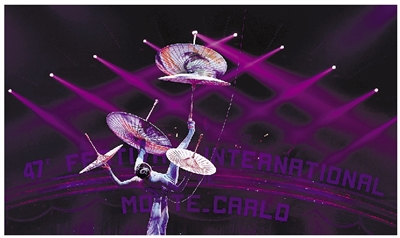 1月17日,第47届蒙特卡洛国际马戏节在摩纳哥蒙特卡洛开幕。图为浙江杂技团演员表演的《蹬伞》在开幕式上惊艳亮相。