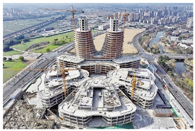 近日,临平新城文化设施综合体项目的“双子塔”主楼核心筒顺利结顶,花瓣形围合的裙楼主体结构已基本完成,整个建筑初具雏形,预计2026年投入使用。