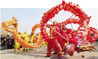 昨天是元宵佳节。作为春节申遗成功后的首个元宵节,赏花灯、猜灯谜、逛庙会、舞龙等传统习俗仍是各地群众欢度节日的首选。图为民间艺人在山东省枣庄滕州市举行的民间游艺展演活动中表演舞龙。 新华社发(王龙飞 摄)